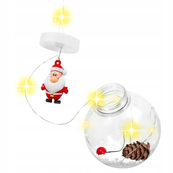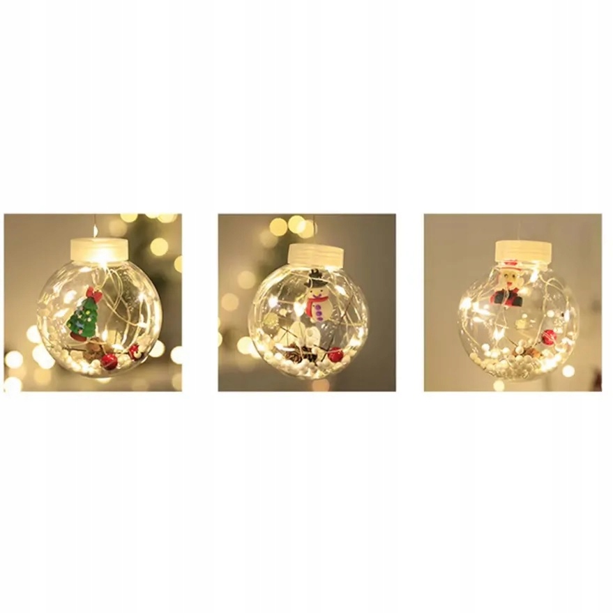Każda kula skrywa w sobie świąteczne figurki – Mikołaja, szyszki, sztuczny śnieg – a delikatne światło LED podkreśla ich urok.