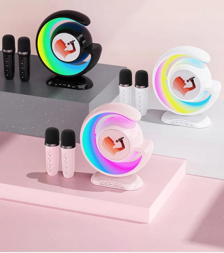 Głośnik karaoke wykorzystuje głośnik 40MM, jakość dźwięku HiFi, głębokie basy i przestrzenne stereo 3D, które mogą zapewniać teksturę muzyki bardziej realistycznie. Zestaw jest wyposażony w mikrofony o wysokiej jakości