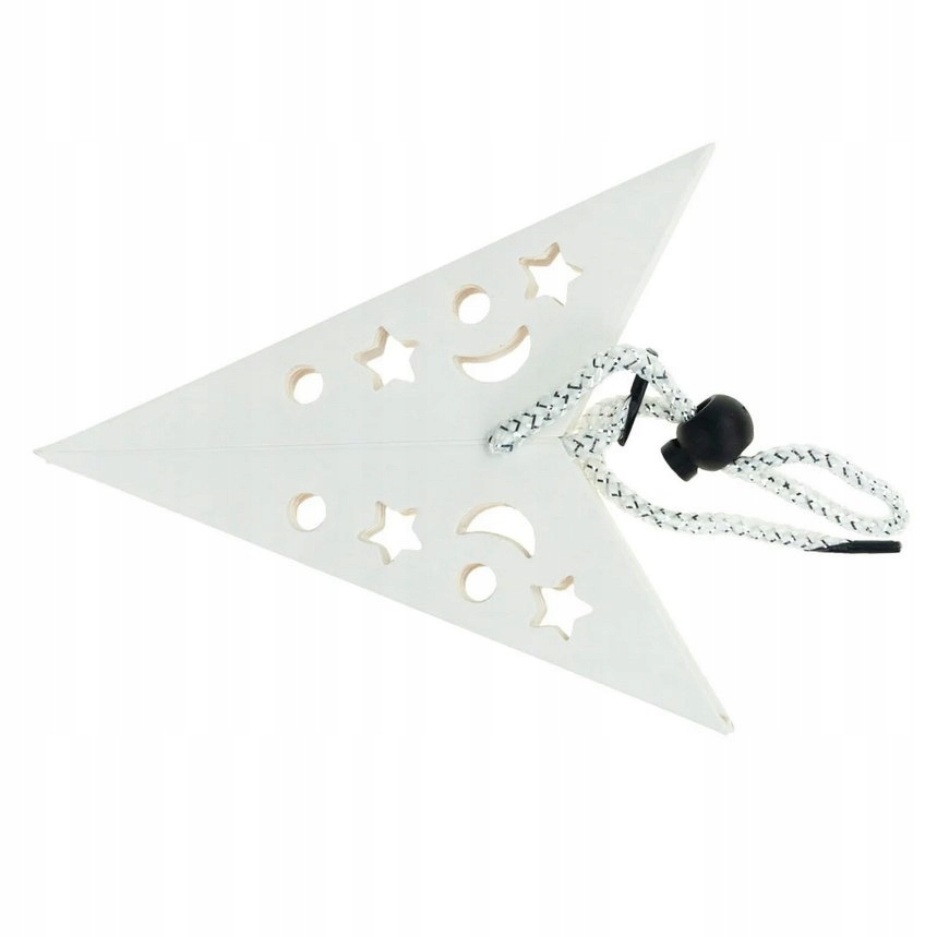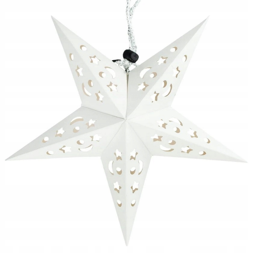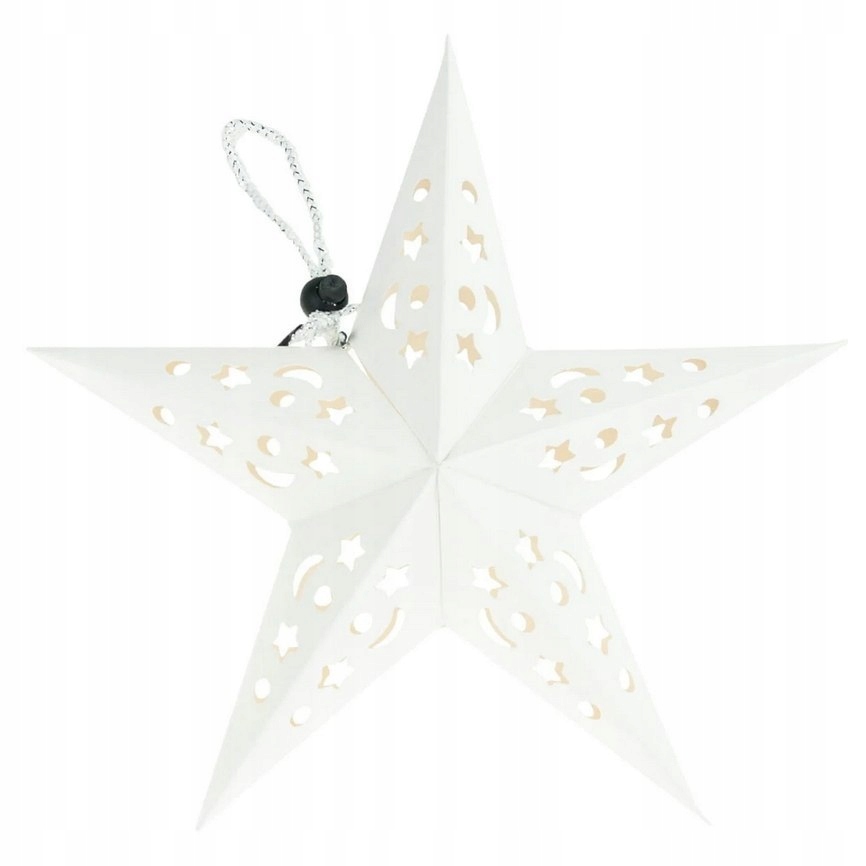Gwiazda papierowa led witraż świąteczna ozdoba na okno wisząca świecąca 3d Świąteczna ozdoba papierowa w kształcie gwiazdy oraz lampkami led. Przydatna jako wystrój wnętrza podczasświąt, imprez i wyjątkowych uroczystości, ozdabiania pomieszczeń lub jako całoroczna ozdoba pokoju dziecięcego. Gwiazda jest łatwa do złożenia i przechowywania, została wykonana z trwałej i grubej tektury w formacie 3D. Załączone lampki LED (10 diod) dająsubtelne i klimatyczne światło. Za pomocą dołączonego białego sznurka można ją podwiesić do żyrandola lub sufitu, świetnie prezentuje się zawieszona w oknie na karniszu - widać ją wtedy zarówno wewnątrz mieszkania jak i z zewnątrz. Na powierzchni znajdziemy ażurowy wzór w małe gwiazdki.