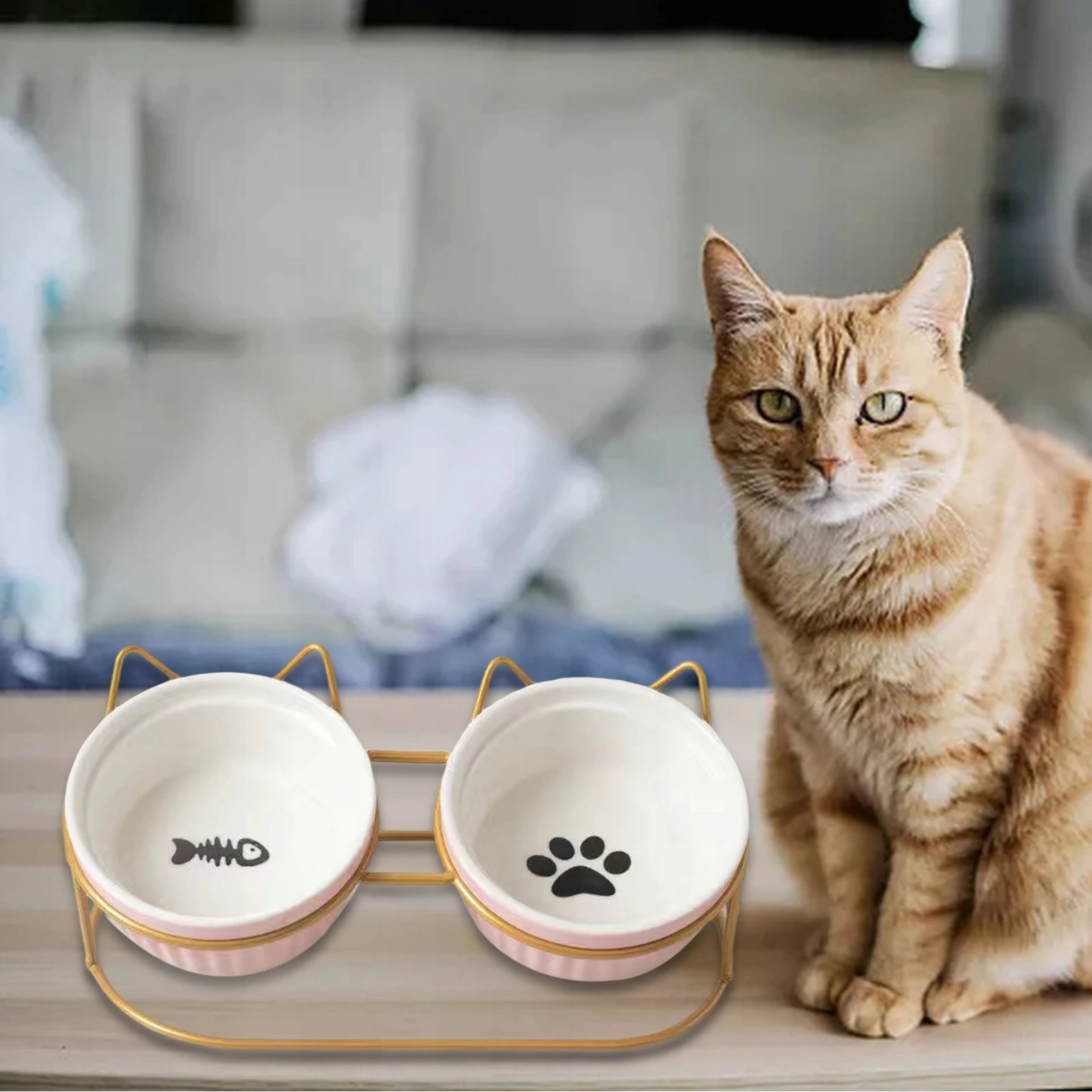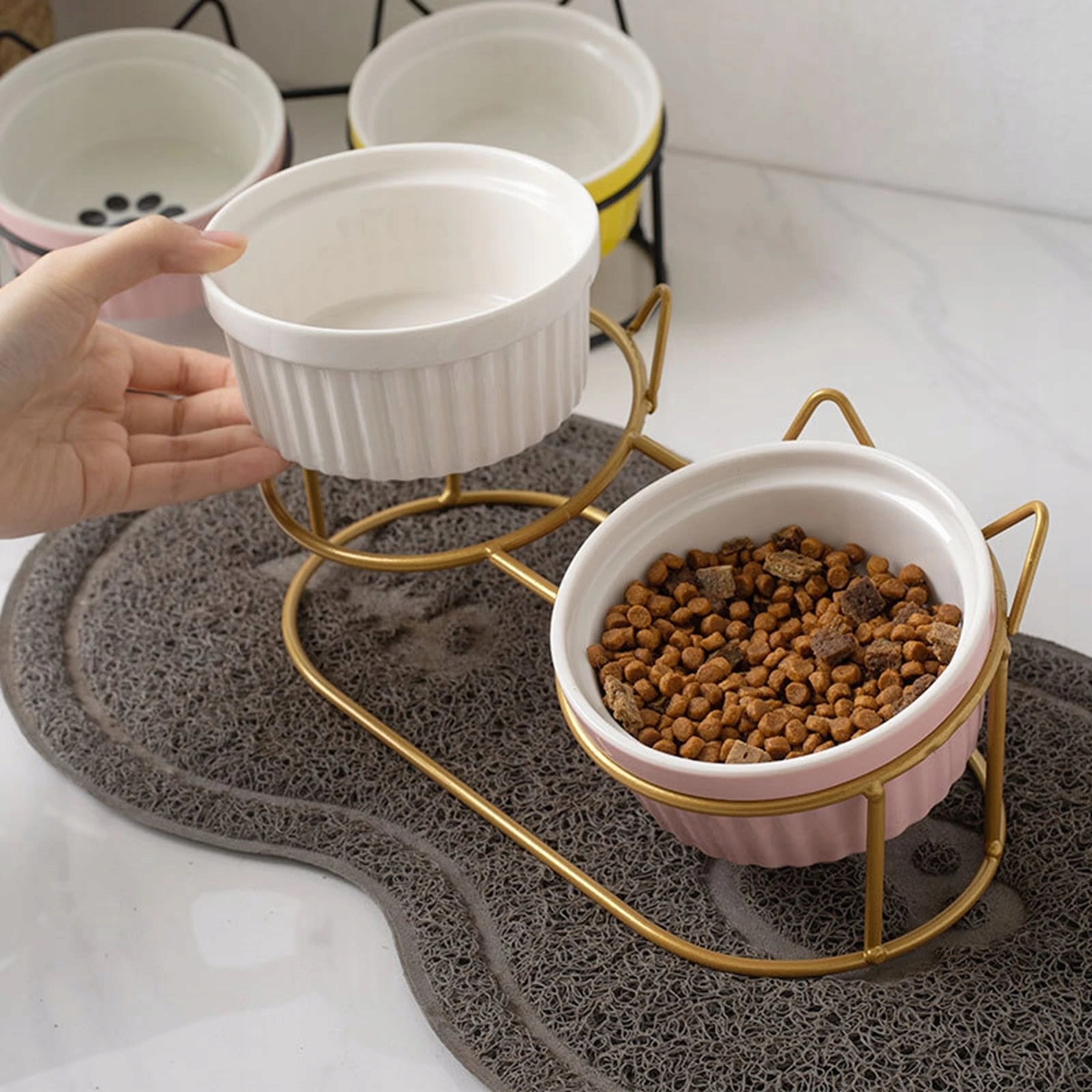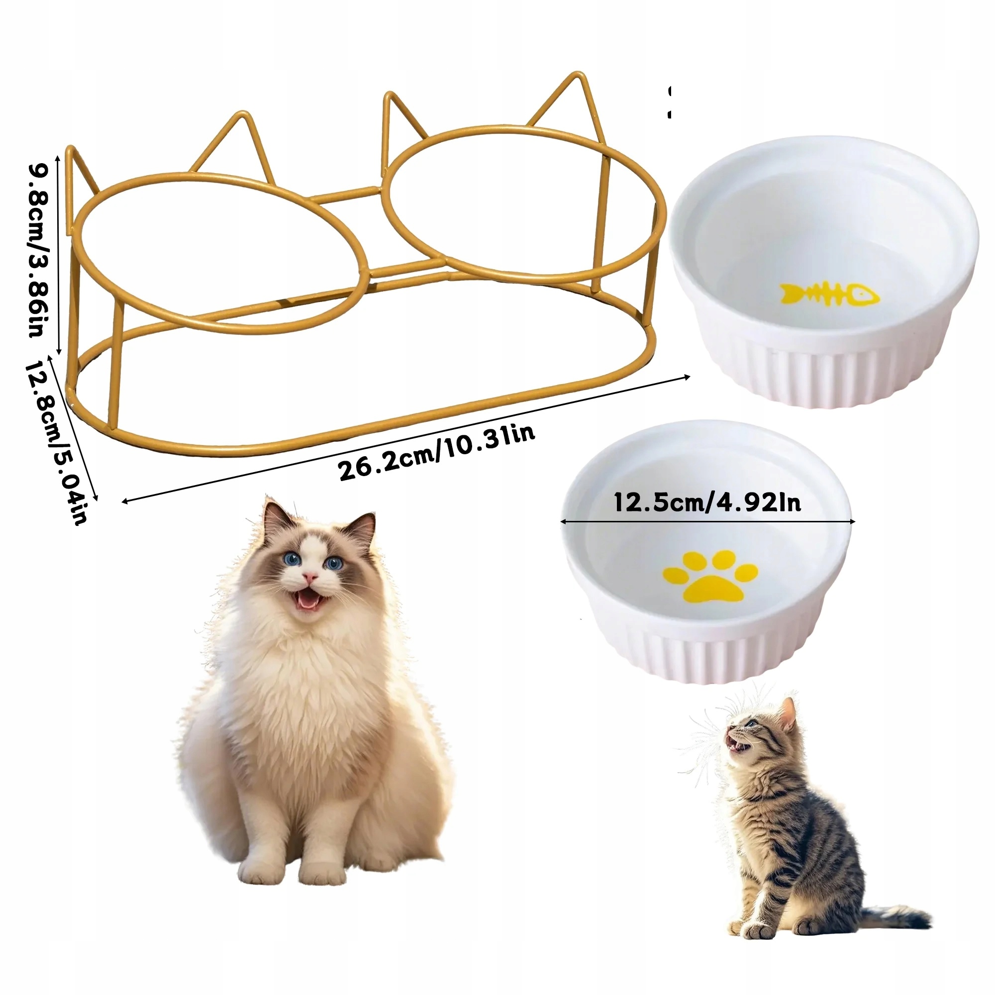 Idealne rozwiązanie dla Twojego pupila! ? Dwie eleganckie miski ceramiczne o łącznej pojemności 600 ml, umieszczone na stabilnym metalowym stojaku, który zapewnia wygodę podczas jedzenia i picia.