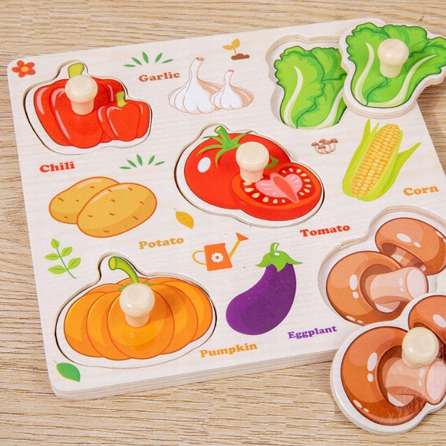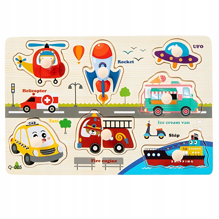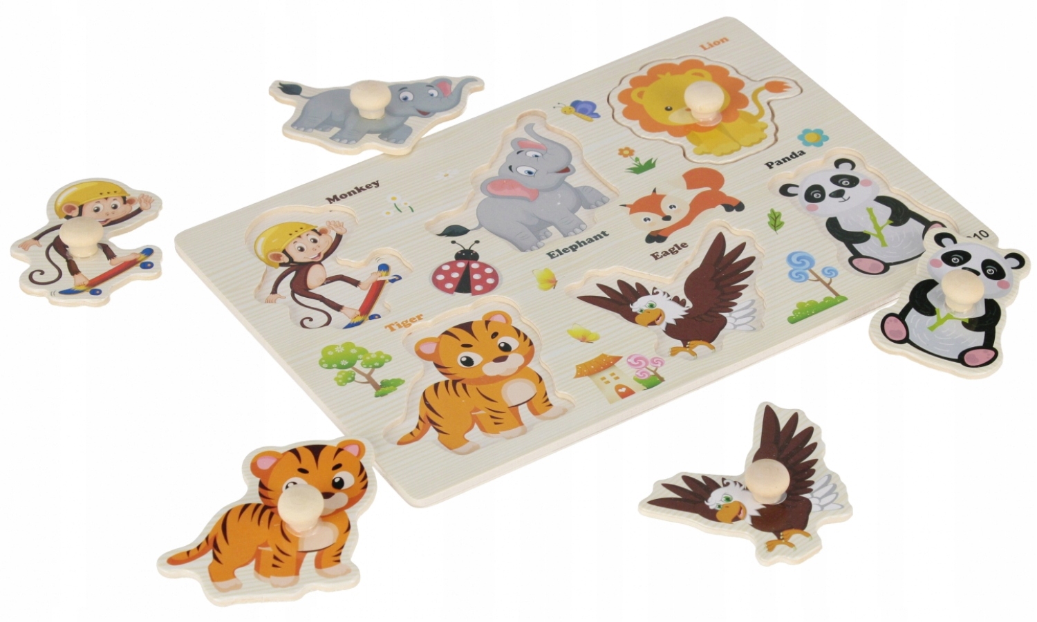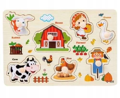 Układanka posiada drewniane uchwyty, które ułatwiają wyjmowanie i wkładanie elementów nawet najmłodszym dzieciom.